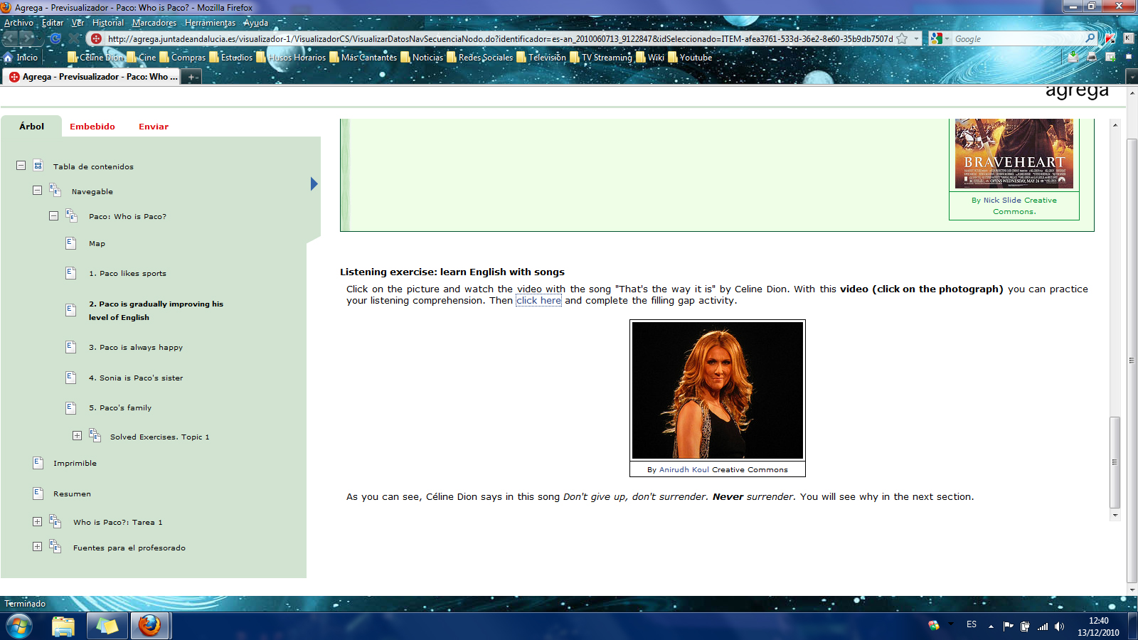 celínico_sin_remedio Posted December 30, 2010 at 05:54 AM Posted December 30, 2010 at 05:54 AM Esta experiencia ha sido de lejos la mayor sorpresa espontánea celinesca de mi vida. Fue hace unos meses, y hasta ahora no me he decidido a postear sobre ello, aunque hubiera capturado la imagen que lo demuestra hace menos tiempo. Este panorama me lo encontré así de repente en el mes de octubre, en el instituto: era última hora, y estaba fijamente atento a lo que la profesora de inglés estaba explicando a través del proyector que muestra la actual pantalla de su ordenador en el que navega por la plataforma donde están los temas y las lecciones. Ella acababa de decir que al final del tema había como curiosidad una canción de Mariah Carey; un rato después de explicar otras cosas cliqueó y... Ese día estuve tres horas o más seguidas pensando en esto... totalmente embebidido. Realmente fue una impresión, que al ser tan inesperada y fuerte, me dio más fuerzas que ninguna otra.Y, ya no sé si será casualidad o no, pero no mucho tiempo después empezó a pasar algo muy distinto y realmente bueno en mi vida. Lo demás, ya se verá... Quote "No matter where you are, reach for your own star to realize the power of the dream" From miss Céline Dion to the world those with a will to listen, and not just hear
