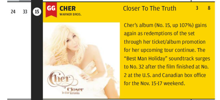 Timster Posted November 6, 2013 at 03:44 PM Posted November 6, 2013 at 03:44 PM I forgot to mention, Cher's album is #10 again this week in the UK Quote
