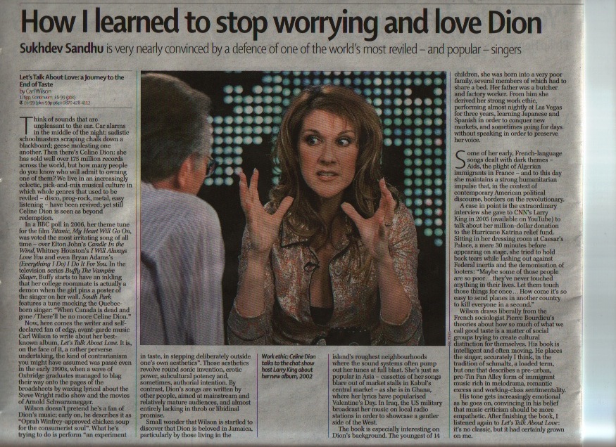 Bellamy Posted February 2, 2008 at 09:34 AM Posted February 2, 2008 at 09:34 AM Learning to love Celine Dion Last Updated: 12:01am GMT 02/02/2008 Sukhdev Sandhu reviews Let's Talk About Love: a Journey to the End of Taste by Carl Wilson Think of sounds that are unpleasant to the ear. Car alarms in the middle of the night; sadistic schoolmasters scraping chalk down a blackboard; geese molesting one another. Then there's Celine Dion: she has sold well over 175 million records across the world, but how many people do you know who will admit to owning one of them? We live in an increasingly eclectic, pick-and-mix musical culture in which whole genres that used to be reviled - disco, prog-rock, metal, easy listening - have been revived; yet still Celine Dion is seen as beyond redemption. In a BBC poll in 2006, her theme tune for the film Titanic, My Heart Will Go On, was voted the most irritating song of all time - over Elton John's Candle In the Wind, Whitney Houston's I Will Always Love You and even Bryan Adams's (Everything I Do) I Do It For You. In the television series Buffy The Vampire Slayer, Buffy starts to have an inkling that her college roommate is actually a demon when the girl pins a poster of the singer on her wall. South Park features a tune mocking the Quebec-born singer: "When Canada is dead and gone/There'll be no more Celine Dion." Now, here comes the writer and self-declared fan of edgy, avant-garde music Carl Wilson to write about her best-known album, Let's Talk About Love. It is, on the face of it, a rather perverse undertaking, the kind of contrarianism you might have assumed was passé even in the early 1990s, when a wave of Oxbridge graduates managed to blag their way onto the pages of the broadsheets by waxing lyrical about the Steve Wright radio show and the movies of Arnold Schwarzenegger. Wilson doesn't pretend he's a fan of Dion's music; early on, he describes it as "Oprah Winfrey-approved chicken soup for the consumerist soul". What he's trying to do is perform "an experiment in taste, in stepping deliberately outside one's own aesthetics". Those aesthetics revolve round sonic invention, erotic power, subcultural potency and, sometimes, authorial intention. By contrast, Dion's songs are written by other people, aimed at mainstream and relatively mature audiences, and almost entirely lacking in throb or libidinal promise. Small wonder that Wilson is startled to discover that Dion is beloved in Jamaica, particularly by those living in the island's roughest neighbourhoods where the sound systems often pump out her tunes at full blast. She's just as popular in Asia - cassettes of her songs blare out of market stalls in Kabul's central market - as she is in Ghana, where her lyrics have popularised Valentine's Day. In Iraq, the US military broadcast her music on local radio stations in order to showcase a gentler side of the West. The book is especially interesting on Dion's background. The youngest of 14 children, she was born into a very poor family, several members of which had to share a bed. Her father was a butcher and factory worker. From him she derived her strong work ethic, performing almost nightly at Las Vegas for three years, learning Japanese and Spanish in order to conquer new markets, and sometimes going for days without speaking in order to preserve her voice. Some of her early, French-language songs dealt with dark themes - Aids, the plight of Algerian immigrants in France - and to this day she maintains a strong humanitarian impulse that, in the context of contemporary American political discourse, borders on the revolutionary. A case in point is the extraordinary interview she gave to CNN's Larry King in 2005 (available on YouTube) to talk about her million-dollar donation to the Hurricane Katrina relief fund. Sitting in her dressing room at Caesar's Palace, a mere 30 minutes before appearing on stage, she tried to hold back tears while lashing out against Federal inertia and the demonisation of looters: "Maybe some of those people are so poor… they've never touched anything in their lives. Let them touch those things for once… How come it's so easy to send planes in another country to kill everyone in a second." Wilson draws liberally from the French sociologist Pierre Bourdieu's theories about how so much of what we call good taste is a matter of social groups trying to create cultural distinction for themselves. His book is intelligent and often moving. He places the singer, accurately I think, in the tradition of schmaltz, a loaded term, but one that describes a pre-urban, pre-Tin Pan Alley form of immigrant music rich in melodrama, romantic excess and working-class sentimentality. His tone gets increasingly emotional as he goes on, convincing in his belief that music criticism should be more empathetic. After finishing the book, I listened again to Let's Talk About Love: it's no classic, but it had certainly grown on me.http://www.telegraph.co.uk/arts/main.jhtml...02/bowil102.xml Quote Please support the forum by ordering everything through our special Amazon.com link Click here. Thank you!