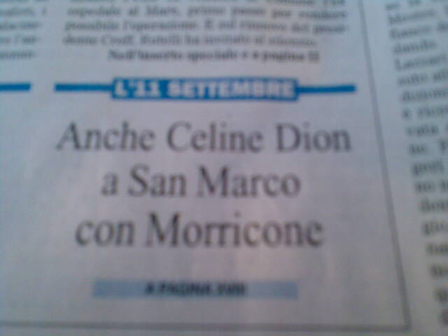 SHEILA Posted September 2, 2007 at 11:18 AM Posted September 2, 2007 at 11:18 AM (edited) io abito a 20 minuti da Venezia e ci vado eccome in + ragazzi ieri mi arriva un mms da una mia amica che stava leggendo in un bar il gazzettino di Venezia e vi posto la foto del titolo... dentro il giornale poi c'era una foto di Celine, e purtroppo l'articolo però non l'hanno letto, però insomma è gia qualcosa Edited September 2, 2007 at 11:19 AM by SHEILA Quote http://www.celinedionforum.com/index.php?a...st&id=26632