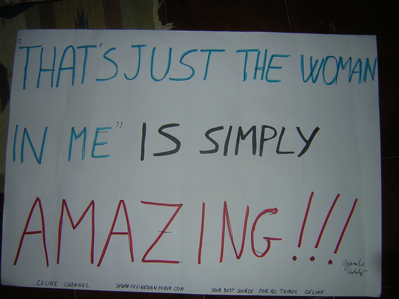 Giancarlo_vadala Posted November 11, 2007 at 07:11 PM Posted November 11, 2007 at 07:11 PM IL MIO CARTELLONE!!! GRAZIE ILARIA!!! THAT'S JUST THE WOMAN IN ME IS SIMPLY AMAZING!!! Quando rivedete l'intervista, badate bene alla posizione di giancarlo, ovvero quello con la camicia nera e cravatta rossa..Se ci fate caso, ha cambiato almeno 6 posti nel corso dell'intervista..Era un'anima in pena!! Camicia viola scuro e cravatta arancione. Cmq è vero, krikky, ero un'anima in pena! Ho cambiato posizione circa 6 volte!!!! Quote Merci Monsieur Angélil pour tout ce que vous avez fait, pour l'avoir aimée jusqu'au bout. Aujourd'hui on sait que Céline n'est pas vraiment Céline sans vous.