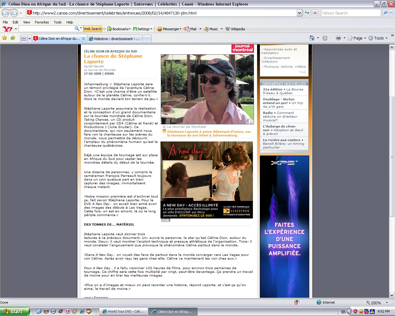 nano Posted February 17, 2008 at 08:54 PM Posted February 17, 2008 at 08:54 PM HERE you can read a little bit more about the DVD. Also, the ad near the article features Celine's A New Day, and you can see her sing a French song backstage. Just refresh the page if you can see it from the begining. I think it's something on Videotron, and by the looks of it, they have exclusive footage that's not on the A New Day... DVD. Maybe someone from Canada can figure out what it is exactly, it would be great. Run your mouse over the ad to see her sing. This is how it looks like, I took a screen shot... You have to refresh a lot to get the ad.Thanks for the article, Teodora lol...after hitting 'F5' for million times, I finally saw both of the ads/videos. Is the part where she sings the French song on the Canadian and/or French AND DVD??? It's wonderful..and I wanna see more. I made a terrible recording of it..just because I don't wanna spend another 15 minutes trying to see it. http://uk.youtube.com/watch?v=1B6aWVTv-P4 "Today, I’m a person on a path of connecting with my source and understanding that I am on the leading edge of creation.."