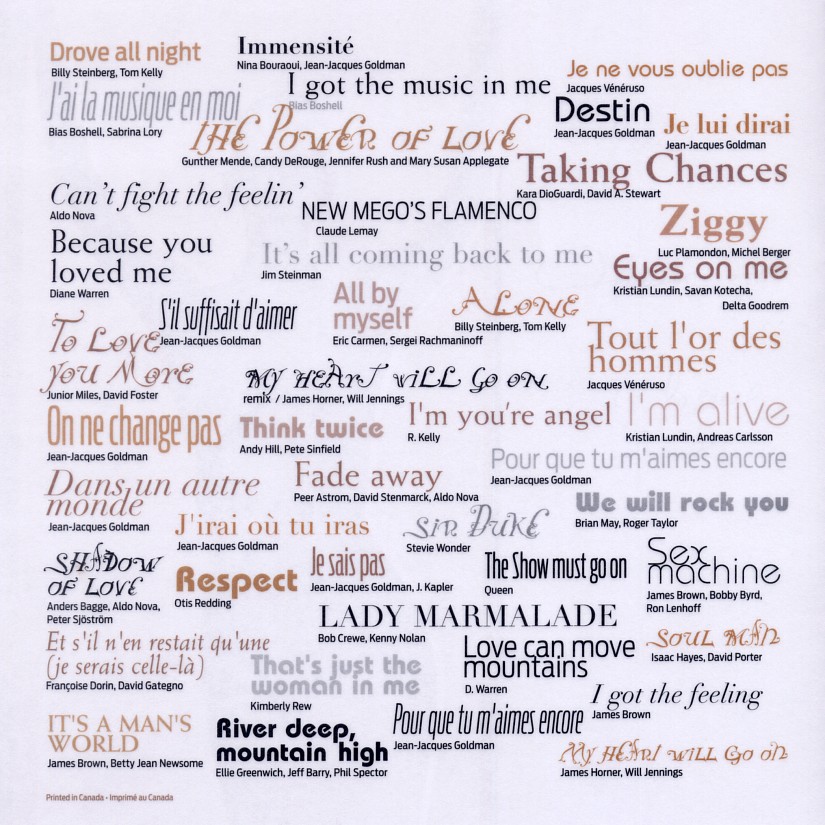 SuperLove4Celine Posted February 27, 2015 at 06:14 AM Posted February 27, 2015 at 06:14 AM this should be okthe song list For the life of me, I will never understand why "Je lui dirai," "Immensite" and "Je ne vous oublie pas" were cut from the set list and never performed once during the tour. At least "On ne change pas" and "Tout l'or des hommes" got to see the light of day in one city during the tour. Such a shame. Quote