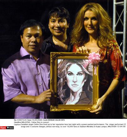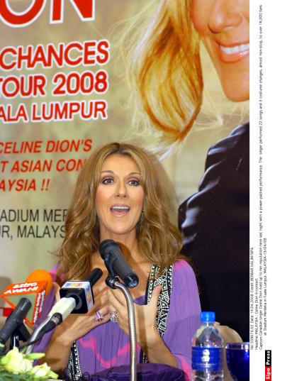 Krys Posted April 14, 2008 at 02:27 PM Posted April 14, 2008 at 02:27 PM Galaxie Blog Celine Dion In MalaysiaPosted on 13-Apr-2008 http://galaxieblog.com.my/blog/photos/2008/4/13/gordon1127_1.JPGThe batik shawl is a gift from Tourism Malaysia. Five hours before her first concert in Malaysia, Celine Dion held a brief press conference (it was so short only eight questions were allowed and the room was packed with journalists from Malaysia and abroad) at Ritz-Carlton in Kuala Lumpur. Known more for her vocal prowess than her sense of style (remember that faux pas at the Oscars where she wore a tuxedo backwards? ), Celine actually looked stylish (and fashion foward too!) in a lavender gypsy-inspired top, sequinned vest, asymmetrical skirt and gladiator shoes (by Alaia). The Canadian chanteuse admitted that, just like other high-profiled celebrities, she too was giddy with fame and popularity when she first hit it big. "I had my head in the clouds. But it was the people around me, like my manager and husband, who brought me down to earth again. I can tell you now, for certain, that I am well-grounded. For me, I just do the showbiz job that I have to do but I do not participate in (the fame game)," the 40-year-old singer said. Celine performs at Stadium Merdeka tonight. Read more on Celine in the upcoming issue of Galaxie.Blogger: Gordon Kho Quote