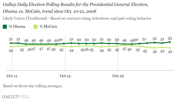 Love, Posted November 3, 2008 at 04:56 AM Posted November 3, 2008 at 04:56 AM The SwampObama leads McCain by 11 points: Gallup by Frank James Gallup has completed it pre-election polling and all indications are that enough voters support Sen. Barack Obama to make him the next president of the U.S. Here's an excerpt from Gallup's report, based its final Gallup/USA Today tracking poll before Election Day: PRINCETON, NJ -- The final Gallup 2008 pre-election poll -- based on Oct. 31-Nov. 2 Gallup Poll Daily tracking -- shows Barack Obama with a 53% to 42% advantage over John McCain among likely voters. When undecided voters are allocated proportionately to the two candidates to better approximate the actual vote, the estimate becomes 55% for Obama to 44% for McCain. The trend data clearly show Obama ending the campaign with an upward movement in support, with eight to 11 percentage point leads among likely voters in Gallup's last four reports of data extending back to Oct. 28. Obama's final leads among both registered voters and likely voters are the largest of the campaign... ...It would take an improbable last minute shift in voter preferences or a huge Republican advantage in Election Day turnout for McCain to improve enough upon his predicted share of the vote in Gallup's traditional likely voter model to overcome his deficit to Obama. If Gallup is wrong this would be the biggest polling mistake since pollsters got the Harry Truman - Thomas Dewey presidential race wrong in 1948. It would be a monumental embarrassment, to say the least. Given that, it's safe to suspect that Gallup is pretty confident about its modeling and findings. It also must be said that Gallup has been very accurate in presidential cycles in the modern era, even in close races like 2000. So there's a track record which should make Obama supporters very confident and McCain backers fairly discouraged. Posted by Frank James on November 2, 2008 10:57 PM© 2008 Tribune Interactive Quote