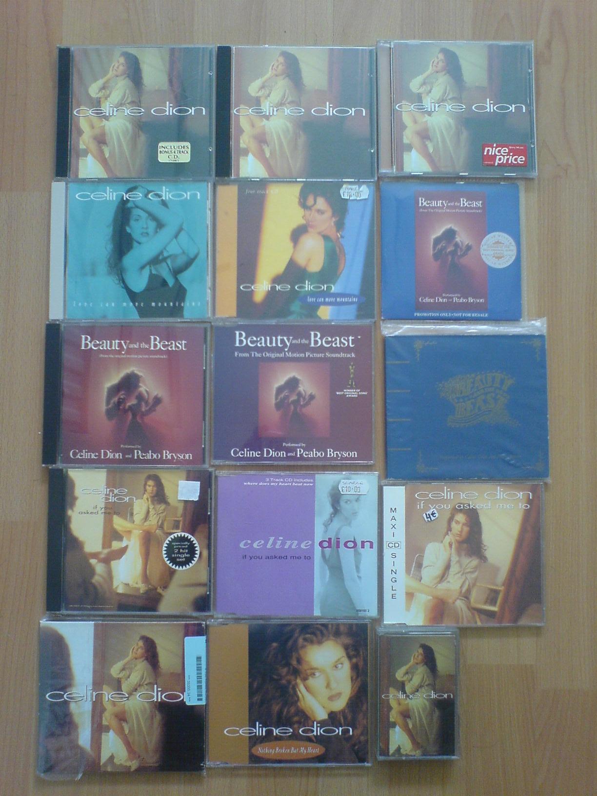 LuisMa Posted October 17, 2007 at 03:38 AM Posted October 17, 2007 at 03:38 AM From the "Celine Dion" album I have the following: "Beauty and The Beast" CD single and cassette single"If You Asked Me To" cassette single, CD single & vinyl single w/picture cover"Nothing Broken But My Heart" vinyl & CD single"Love Can Move Mountains" CD single"Water From The Moon" vinyl & CD single (this one is another of my most cherished possessions) Quote