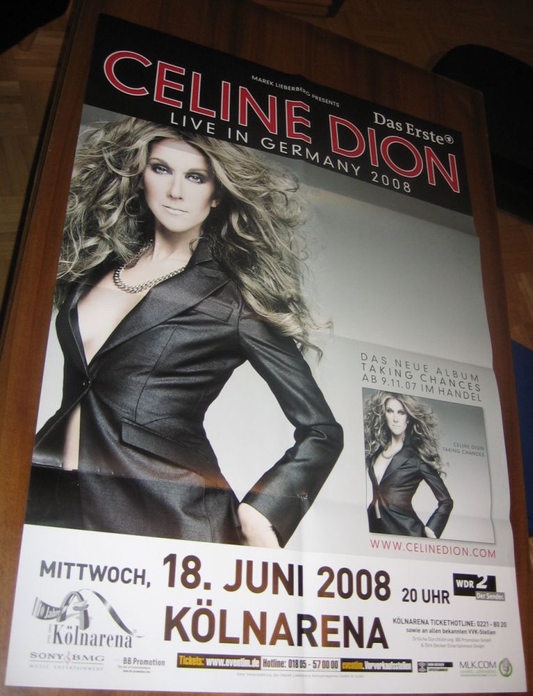 Dionesque Posted November 17, 2007 at 05:18 PM Posted November 17, 2007 at 05:18 PM Recently I haven't bought many Céline items as I've been focused on getting concert tickets, hehe! But I got the promo poster for her concert in Köln, Germany next year! Yay! Quote Visit me on Facebook 14th & 16th May 2008 - Antwerp Sportpaleis24th & 25th May 2008 - Paris Bercy2nd June 2008 - Amsterdam ArenA12th June 2008 - Berlin Waldbühne18th June 2008 - Köln Arena20th June 2008 - Hamburg Colorline Arena28th June 2008 - Kraków Błonia Park1st July 2008 - Vienna Stadthalle15th, 16th, 19th & 20th August 2008 - Montréal Bell Centre10th, 15th & 16th March 2011 - Las Vegas Caesars Palace ColosseumJ'étais là pour toi, Céline! Why has Javito been silenced ???