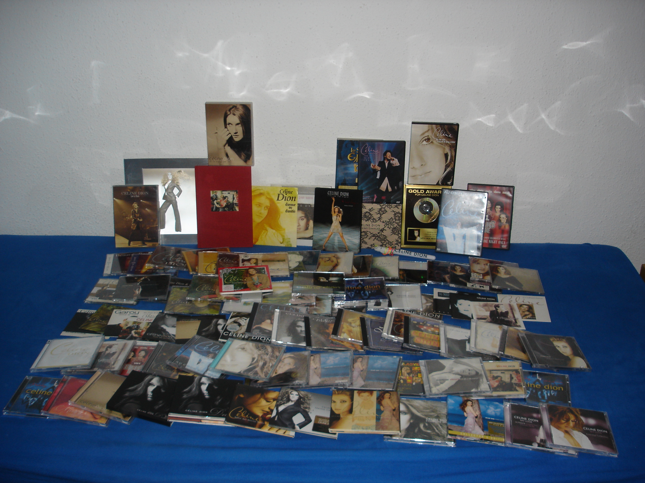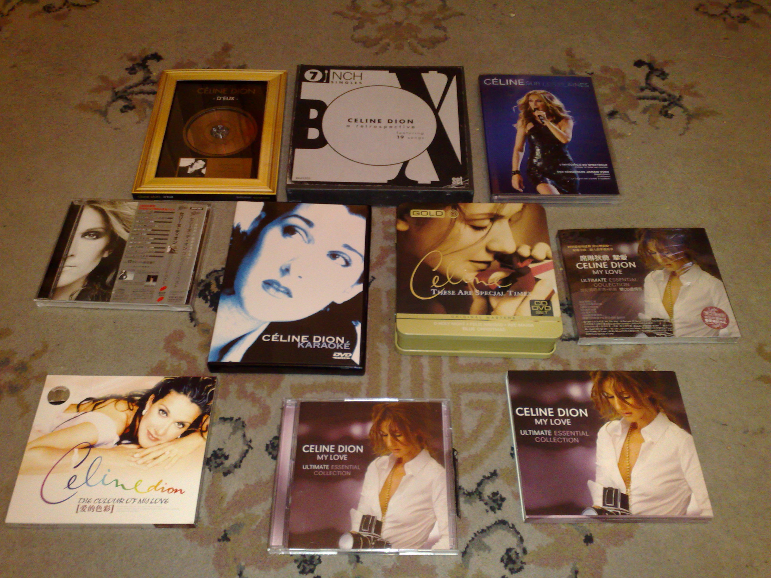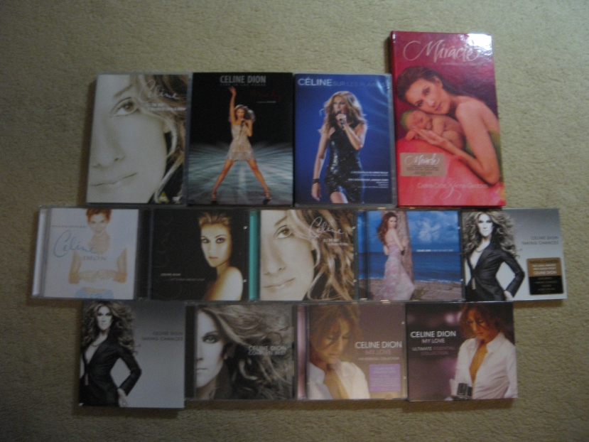 Timster Posted December 7, 2008 at 09:55 PM Posted December 7, 2008 at 09:55 PM (edited) Here's my growing collection Please note: I have only been collecting Celine stuff for a year now (when I bought the AND DVD), however everything else has been bought since I went to Japan in August and bought Complete Best and Taking Chances (with Bonus Tracks), so I am quite pleased with what I have been able to get so far. The only 'rare' item I have is the Miracle CD+DVD Longbox. With some xmas money I am hoping to get:-Ultimate Box -On ne change pas L'integral (Longbox)-1 Fille & 4 Types (CD/DVD/Book) Edited December 7, 2008 at 10:01 PM by ShuttleDiscovery Quote