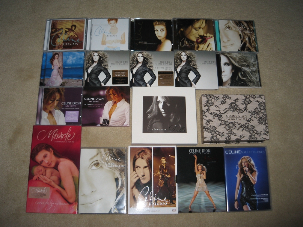ByuSmurf Posted January 4, 2009 at 05:11 AM Posted January 4, 2009 at 05:11 AM Ultimate Box Set 2CD & 3DVD - JapanMy Love Ultimate Essential Collection 2CD - AustraliaTaking Chances 2 Track CD (Map to My Heart) - EUVois Comme C'est Beau 7" - CanadaMy Love Ultimate Essential Longbox 2CD - USAListen to Me VHSCelebration 4 Track Cassette (K7) - CanadaDivas Live Velvet PROMO Box Set Taking Chances 4 Track CD - EUTaking Chances 3 Track CD (Immensité & Map to My Heart) Card Sleeve - EUDans La Main D'un Magicien 7" - Canadahttp://i5.photobucket.com/albums/y157/byusmurf/my%20collection/dec08.jpg Quote http://i5.photobucket.com/albums/y157/byusmurf/siggy12-25-05.jpg