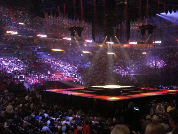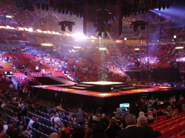 celinebigfan Posted January 28, 2009 at 05:56 PM Posted January 28, 2009 at 05:56 PM Hola genteeeee!Ya estoy de vuelta en casa!!!!! Pero el viernes 23 volvi a ver a Céline en Miami, en otro show espectacular!!!! Céline estaba muuy contenta, y dio un show espectacular!!! El público no fue taaan caluroso y "loco" como en Atlanta, pero estuvo muy bien....en este show había muchas mas gente grande, tal vez por eso!!! Pero fue un sold out total...miren lo que encontré: NEW ATTENDANCE RECORD AT AMERICANAIRLINES ARENA IN MIAMIJanuary 28 , 2009 Celine's Taking Chances World Tour sell-out concert on January 23, 2009 set a new record for the venue with the highest attendance for a single concert in the history of AmericanAirlines Arena in Miami, FL. "It was a special night with a record breaking audience enjoying one of the world's most popular artists in a beautiful setting here in Miami.", said Mike Walker, EVP of Enterprise at AmericanAirlines Arena.Since launching the North American leg of her Taking Chances World Tour in August of 2008, Celine's powerhouse performances have been breaking attendance and box office records throughout the U.S. and Canada. The tour continues in Florida this week. Gloria Estefan y el marido estaban en la audiencia, Céline los presento y dijo que se sentia muuy contenta de tener dos amigos tan especiales entre el público esa noche...Maman Dion también estaba, Céline le hablo, le dijo que estaba muy linda jajaja y la gente no paraba de aplaudir!!!! Voy a ir subiendo algunas fotos ahoraaaa!!!! y les cuento algunas cosas más! Quote