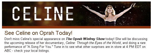 Koolan Posted March 26, 2010 at 09:11 PM Posted March 26, 2010 at 09:11 PM The Oprah Show with Celine, originally on 2/10/10, is re-airing on Tuesday, March 30th for anyone interested in watching again or catching it for a first time. Wonder if that March 30th date is pure coincidence....?! ToniGreat, thanks for the heads up. Missed the first 5 minutes, now I can get it again. Cool! I'm gonna cap it again. I don't have the original Tivo file to re-encode it into Generally Accepted Forum Guidelines but I will encode with those settings this time No need to. Quote Please support the forum by ordering through our Amazon.com referral link below. Click here to go to the Amazon homepage.