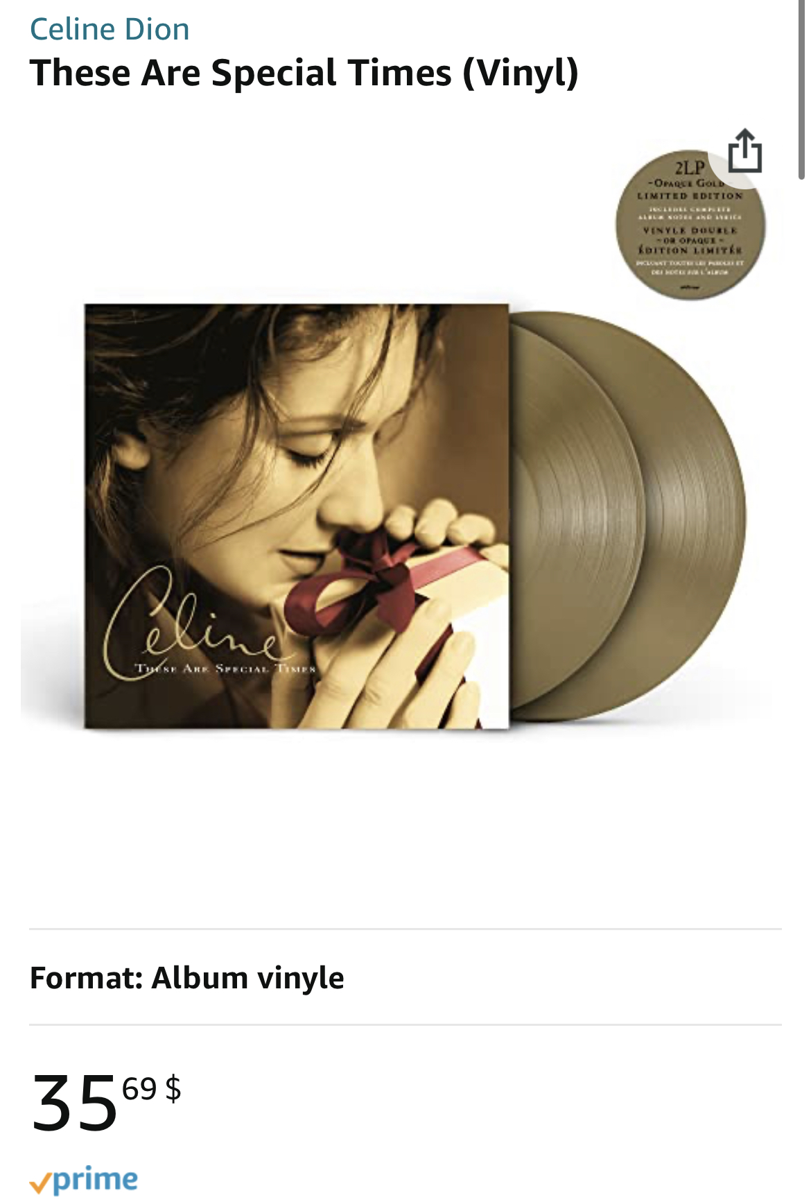 CelineDionFreak Posted September 24, 2022 at 05:16 AM Posted September 24, 2022 at 05:16 AM These are special times on Gold vinyl november 11! Could you share the link to this?? Quote I didn't know love until they loved me back to life because somebody loves somebody!Le temps qui compte pour Celine est maintenant!