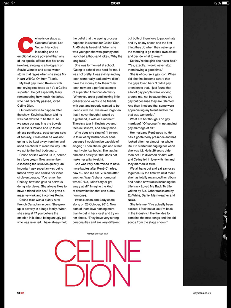 marc-02 Posted November 3, 2013 at 05:20 PM Posted November 3, 2013 at 05:20 PM Hi Guys, As promised I tried to buy a copy of the Gay Times in Manchester but no copies left in the few places I tried. Anyway went high-tech and downloaded the iPad app instead, 2 screenshots attached for you all x She would have been perfect for the role of the music teacher in Unfinished Songs!... She says here shes bad at technology and doesnt know how to turn on a computer... but she also said before she googles and she youtubes! Hahaha 1 Quote
