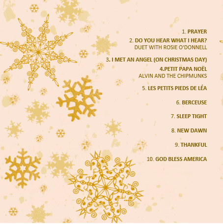 celinesounds Posted December 20, 2014 Posted December 20, 2014 1. PRAYER2. DO YOU HEAR WHAT I HEAR? DUET WITH ROSIE O'DONNELL3. I MET AN ANGEL (ON CHRISTMAS DAY)4.PETIT PAPA NOËL ALVIN AND THE CHIPMUNKS5. LES PETITS PIEDS DE LÉA6. BERCEUSE7. SLEEP TIGHT8. NEW DAWN9. THANKFUL10. GOD BLESS AMERICA Quote #FREEJAVITO
