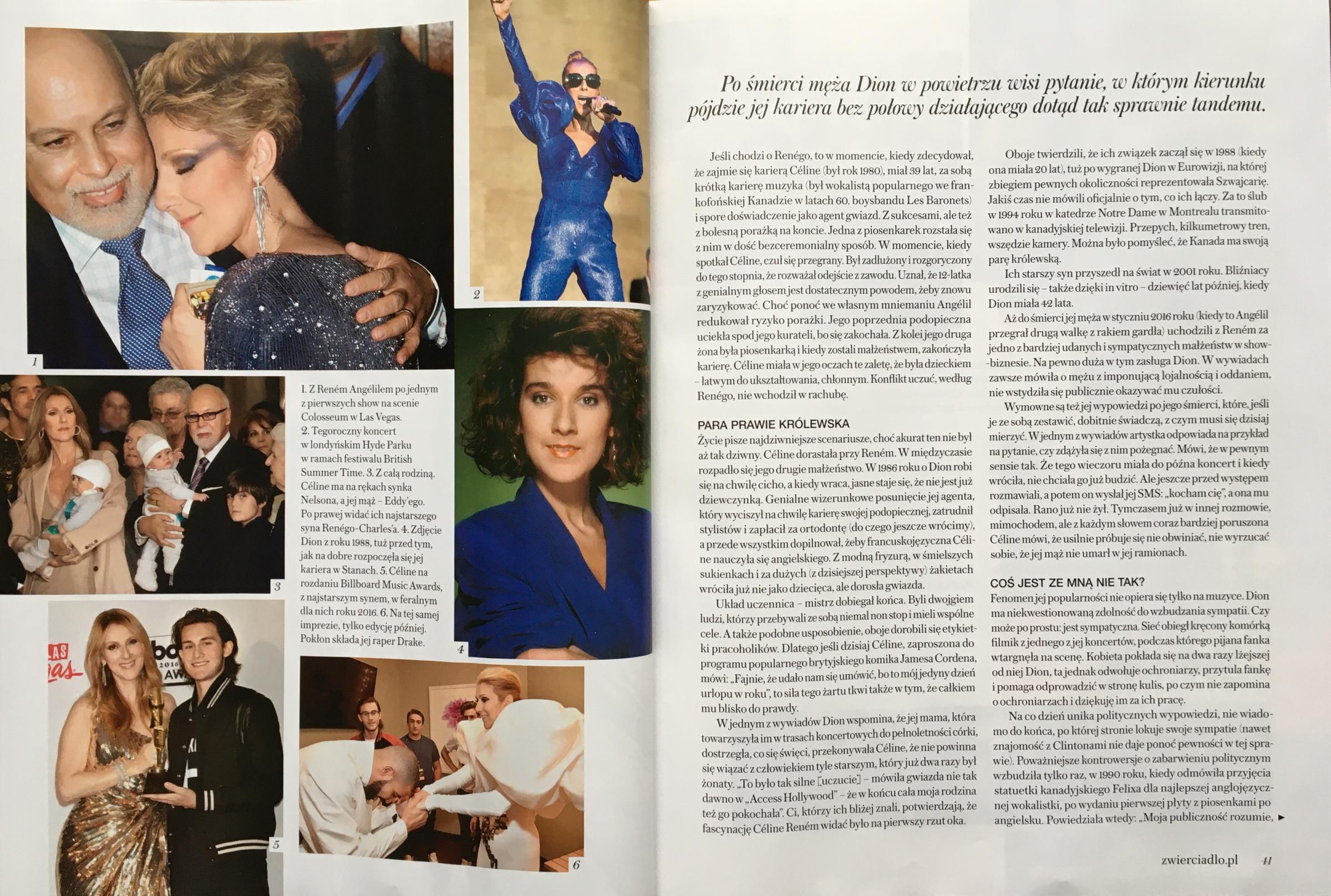 scielle Posted November 9, 2019 at 02:39 AM Posted November 9, 2019 at 02:39 AM Here are some pictures of the article in a Polish female magazine "Zwierciadło". The article is a narrative about her life and career, her life after the loss of Rene, her love for haute couture. There are also some anecdotes, like the story of how she handled that woman who entered the stage during a concert in LV.There's a two-page piece about her "beautiful hair" LOL and an advert for the new album. Thanks for this! For those looking for a translation - there's nothing here you don't already know. It's basically cobbled together from pre-existing interviews, press, and books. The quotes are verbatim translations of previously-released interviews in English. It is well written though, and clearly well researched. (They even mention her pre-Rene manager). Nice to see such an extensive feature, and one that succinctly and effectively summarizes her life and career. 2 Quote