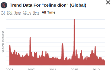 PuraVida Posted September 15, 2021 at 12:40 PM Posted September 15, 2021 at 12:40 PM (edited) Yeah the majority of Céline's "general public" fans were used to new material from her every 12-18 months. Now it's every 5-6 years for a new album. A large majority of her "general public" music buying fans have definitely lost interest. Here are the Youtube and Google search trends for Celine over the recent years. Edited September 15, 2021 at 12:43 PM by PuraVida 1 Quote