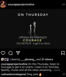 Celinelife Posted October 31, 2021 at 03:56 PM Posted October 31, 2021 at 03:56 PM https://www.instagram.com/p/CVss9xzhFhd/?utm_medium=copy_link IMPORTANT NEWS TO ALL FANS FROM COURAGE PROJECT:-"Hello, everyone. Take a moment to listen to Courage on Spotify. You all know we already a big big listen on YouTube, which got literally so many views, more than it actually gets. You can tell by the comments also. And now, we are going to Spotify on Friday. Celinaics are uniting again to listen to Courage on Spotify a whole MONTH on repeat on Spotify, starting this Friday. You are more than welcome to start early..x" Link to Courage:- Quote