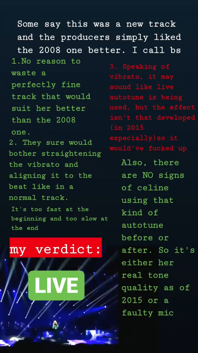 Céline RO Posted March 21, 2020 at 01:31 PM Posted March 21, 2020 at 01:31 PM Not a final piece of explanation at all. How expensive do you think it is to make a note in the studio?It just sounds fake. Sometimes I feel like people don't have the same quality of hearing as others do. But it's fake. No one can hit a note like that (and I don't even think it's that good). It sounds different than the rest that sounds live. So many movements that would be heard in the sound. And that note is so demanding that she just wouldn't be moving like that or have that face. Just compare it with the last note which is live or other times she sang it live. Even the album version sounds way more natural.And no, it's not because we won't hear it again that it has to be considered live. That was the excuse people gave about MHWGO at the Billboard Music Award 2017 until someone much later found that the same track was used elsewhere, once... 1. This is not my explanation, I was just asked to post it on here by its creator. Therefore, don’t accuse me of having a “different quality of hearing” or anything else. 2. I agree that her movements should have affected the sound more. 3. However, Céline can hit a note like that. She could in 2015 and I’m sure she still can now. It’s difficult for her but I have no doubt that she can do it. 4. Again, NOT MY EXPLANATION. Quote The best is yet to come...