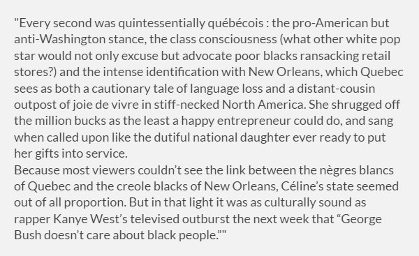 PuraVida Posted June 26, 2020 at 08:10 PM Posted June 26, 2020 at 08:10 PM (edited) Now that you mention it, I remember that was part of the joke: Céline would use a lot of black slang ("sista", "girlfrin"), which showed she didn't understand the subtleties of American pop culture and racism in our country. She worked with and mimicked a lot of black artists, yet didn't understand that White people weren't "supposed" to use that language. I know it's a sensitive subject, especially nowadays, but while we as fans see that as nativité, others might see it as appropriation (or just trying too hard to be cool). Nowadays, I'd say people cut her a lot of slack, to the point that it's seen as somewhat endearing when Céline uses slang. See "Kooky Aunt" comparisons. This topic makes me think of Carl Wilson's excerpt in his book re: Celine on Larry King talking about Hurricane Katrina: Edited June 26, 2020 at 08:12 PM by PuraVida 2 Quote