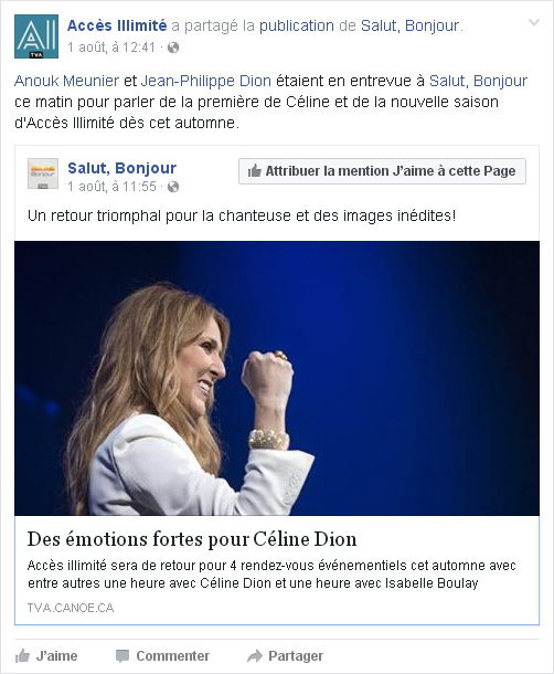 Fuzzy Posted August 22, 2016 at 12:27 PM Posted August 22, 2016 at 12:27 PM Where'd you see this and do you know when it will air?I just overheard people around Céline talk about it saturday afternoon (as I said, the crew from Accès illimité was there).Was it reliable or not? I don't know. On the image, it says 1 hour with Céline (that's the usual lenght of one episode). The new season is scheduled for this autumn (it usually starts in September). No date confirmed yet though.Maybe they will air 2 episodes with Céline?? That would be cool! Accès illimité also followed Céline when she was in New York. 1 Quote http://i43.tinypic.com/vne96v.jpg