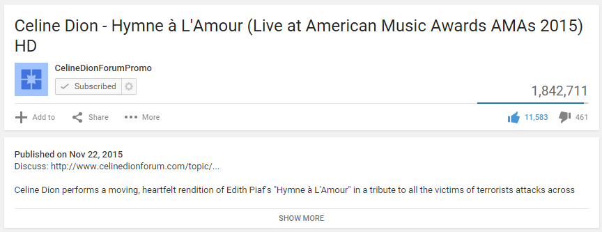 Davey84 Posted November 24, 2015 at 08:03 PM Posted November 24, 2015 at 08:03 PM They blocked the video worldwide now. Stats: 1,826,458 views, 11,574 thumbs up, 460 thumbs down, and 1,607 comments.I wonder if Celine's team is able to reinstate it.That's sooooooooo annoying! was there a reason given?!?! Why does it always seem the whole world is against her! Shouldn't this be about TRIBUTE & HONOR and not about COPYRIGHTS & MONEY 4 Quote http://img.photobucket.com/albums/v75/daveyh84/incognito198701_zpsaaootxh1.jpgRick, ik hou van jou voor altijd!A New Day... has come 28/29 April & 2/3 May 07Antwerpen 13 et 14 mai,Paris 24 et 25 mai, Amsterdam 2 juinet Arras 7 juillet Chances Taken!!!How Do You Keep The Music Playing? - Celine Opening Night March 15th, March 16th