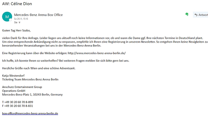 comingback Posted November 30, 2016 Author Posted November 30, 2016 Ich habe gestern die Mercedes-Benz Arena in Berlin per Mail angeschrieben.Die haben aber noch keine Info über ein Celine Konzert. Entweder dürfen die offziell noch nichts mitteilen oderdie Info folgt noch. Die Hoffnung stirbt zuletzt.. Quote