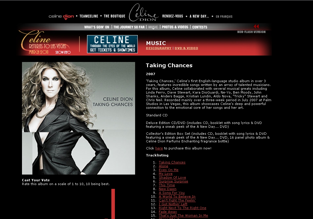 nati Posted February 19, 2010 at 05:58 PM Posted February 19, 2010 at 05:58 PM What have celinedion.com done to the Taking Chances cover?! it's fine on my computer Thanks Celine for the great memories. I will never forget you