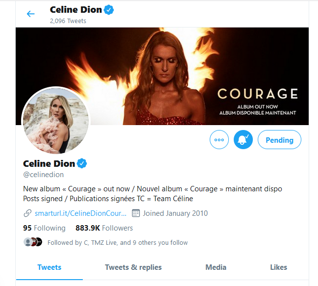 Taking Chances Posted December 14, 2019 at 03:07 AM Posted December 14, 2019 at 03:07 AM (edited) Did something happen to Celine's Twitter, or is this an issue with my account? Suddenly I can't follow her, and it says pending. I'm so confused. I've been following her since forever, so I have no idea why this happened. Edited December 14, 2019 at 03:08 AM by Taking Chances