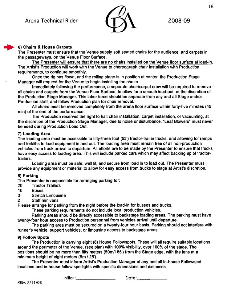 Belle Céline Posted July 2, 2009 at 06:04 PM Posted July 2, 2009 at 06:04 PM these are the 'rider(s)' that the article talks about right? http://i44.tinypic.com/14kl5hc.jpg Probably. Honestly, I don't think it's Celine making all of these demands. I think it's Rene making them and Celine has just sort of taken it for granted and not questioned it. I mean, i'm sure Celine has mentioned she wants some things done, but I don't think she's made them draw all that up. That's Rene's work.I think they are all resonable requests, nothing over the top. They do have to have room for all the equipment, they have to have the right set up to do the lighting, they need decent dressing rooms, she has some favorite foods that they bring, nothing seems demanding to me. “There’s nothing I love more than the romance of a night in the theater.”http://i39.tinypic.com/ws0due.png