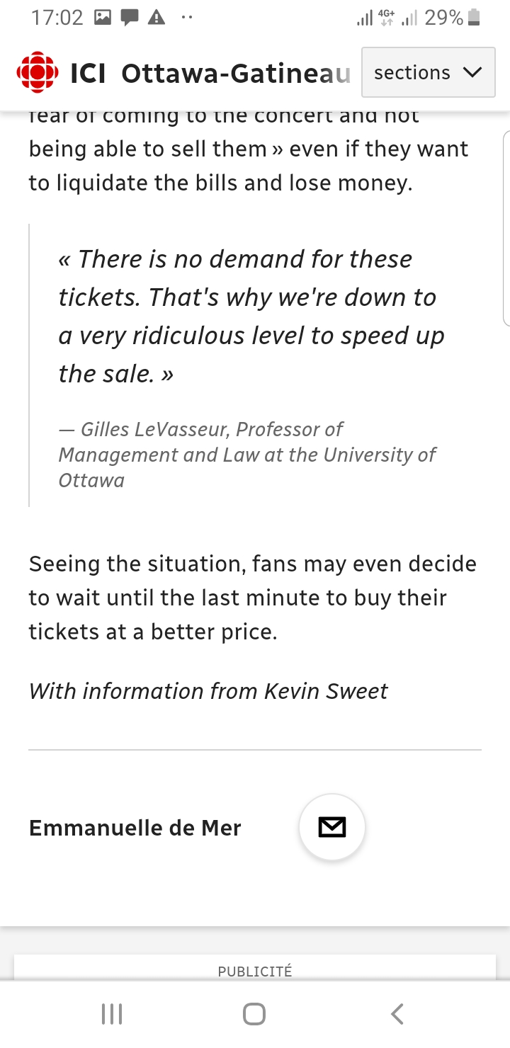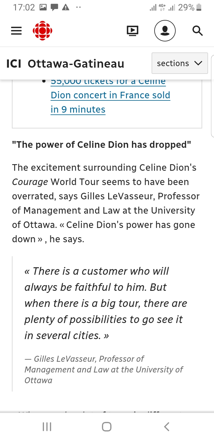 Javito Posted October 16, 2019 at 07:10 AM Posted October 16, 2019 at 07:10 AM Not good press for her in Canada... https://ici.radio-canada.ca/nouvelle/1346764/billets-prix-vente-celine-dion-spectacles-ottawa-tournee-courage?accesVia=partage&partageApp=appInfoAndroid Quote "Hush, now... I see a light in the sky"