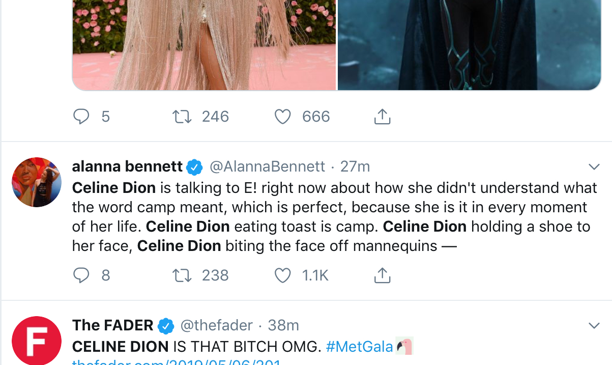 Popular Post scielle Posted May 6, 2019 at 11:02 PM Popular Post Posted May 6, 2019 at 11:02 PM https://www.nytimes.com/2019/05/06/fashion/celine-dion-camp-fashion-met-gala.html 8 Quote