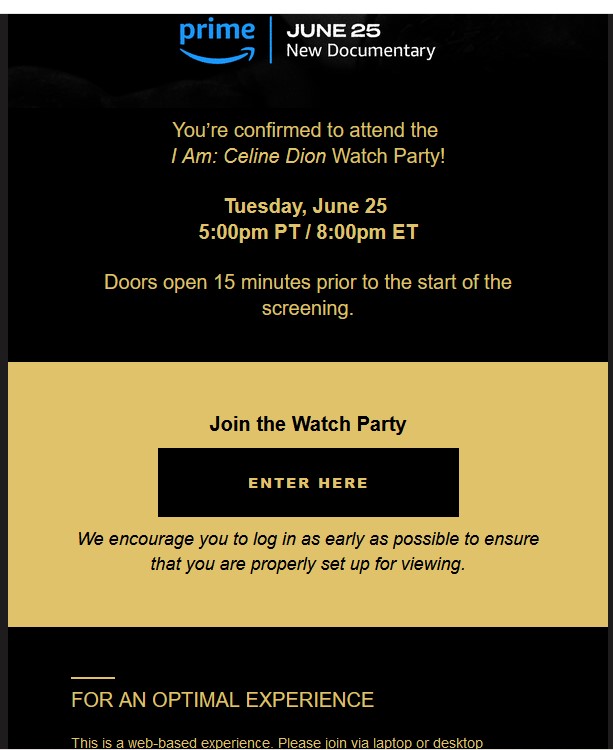 Nmj Posted June 21, 2024 at 12:04 AM Posted June 21, 2024 at 12:04 AM When I registered got this email maybe they will limit how many can view her message or doing some virtual thing where chat with each other, at bottom had this FOR AN OPTIMAL EXPERIENCE This is a web-based experience. Please join via laptop or desktop computer with a reliable internet connection of at least 10 mb/s using recommended browser, Google Chrome. For enhanced viewing, you may cast to a TV using an Apple TV device or by connecting an HDCP-compliant HDMI cable to your TV. Other supported Apple browsers include Firefox, Safari, and Opera on Mac OSX 10.12 or higher. If you're using an iPad/iPad Pro/iPhone, use Safari. Other supported PC browsers include Firefox, and Opera on Windows 7, Windows 8.1 or Windows 10. Microsoft Edge and Internet Explorer are not supported. One of the things that came out of the pandemic when we needed to be with people while physical distancing. It can be nice to chat with a few friends and interact with a movie but just like a livestream with messages scrolling way too fast, I know I’d get a headache after a few mins, let alone 100 mins. https://variety.com/2020/digital/news/amazon-prime-video-launches-watch-party-1234693515/ Someone can screen grab Celine’s message, i want to watch it on my tv in peace for the first time lol. 1 Quote