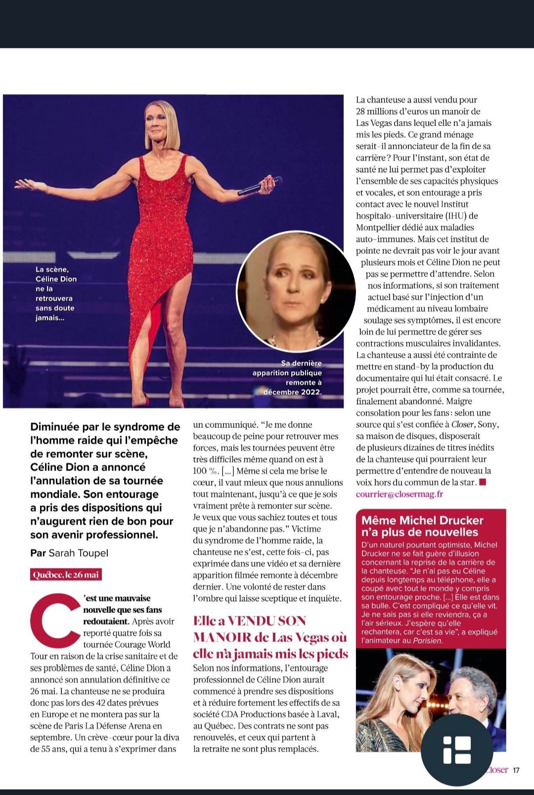 CelinesDIVO5 Posted June 17, 2023 at 03:53 PM Posted June 17, 2023 at 03:53 PM The press is echoing the tabloid news about Celine having a worsening of the disease.Sometimes I believe it, because I remember that when the rumors about her not walking emerged, they were true, the disease causes that.I hope Barnvev's news is true and that she is getting better. We don’t know what’s true and what isn’t until Celine confirms it herself. 3 Quote https://www.youtube.com/watch?v=PL54qnRGM2gMatthew Charles - "Fix You" - Live at The Stonewall InnStonewall Sensation - Season 15Originally written and performed by Coldplay