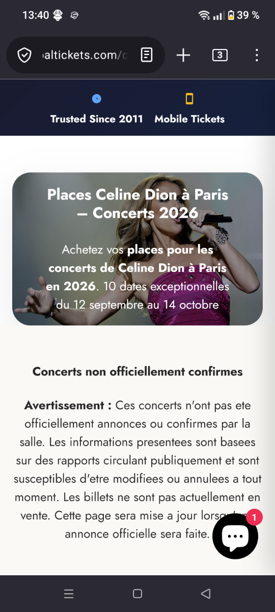 comingback Posted March 9, 2026 at 12:57 PM Posted March 9, 2026 at 12:57 PM (edited) There is a rumor about a concert series in the Defense Arena/Paris in September/October 2026. Fingers crossed! https://goaltickets.com/collections/places-celine-dion-paris-2026 Edited April 10, 2026 at 10:18 AM by Davey84 Number of concerts 2 Quote