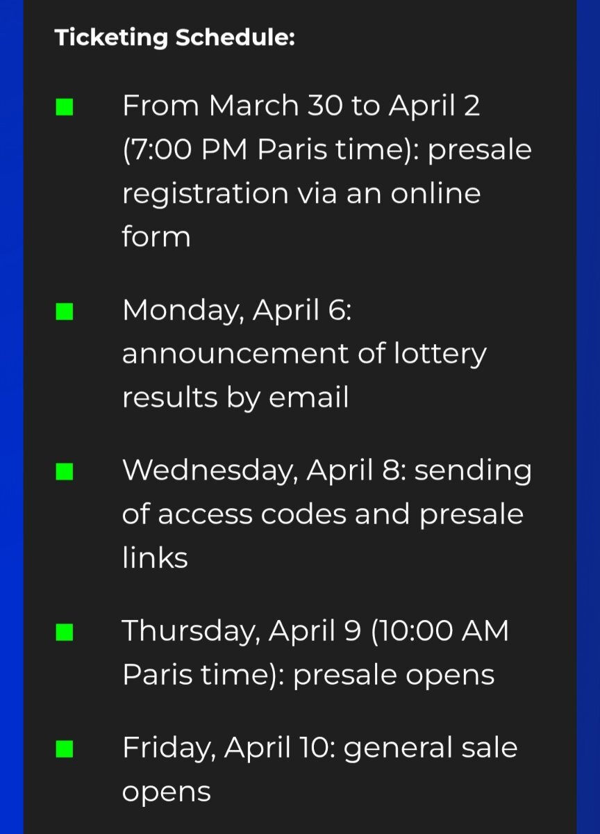 emiliejolie Posted March 31, 2026 at 07:39 AM Posted March 31, 2026 at 07:39 AM For visa presale, it will be in the 8th. if you have an infinite card : presale start at 10:00 ( French time) if you have premier or platinum card it will start at 17:00 Registration on application My Visa Quote