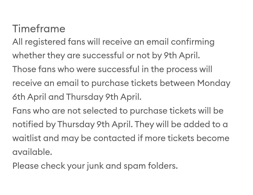 No1IrishFan Posted March 31, 2026 at 06:20 AM Posted March 31, 2026 at 06:20 AM So it’s three presales; AXS (Artist presale), Ticketmaster (Venue presale) and Visa. AXS starts on Tues 7th Apr and TM starts on Thurs 9th Apr. I think both will email on Monday 6th to confirm if successful or not. Visa presale details not confirmed yet. Correct me if I’m wrong on any of this 1 Quote