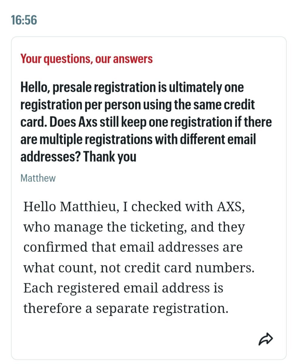 Dancing_Queen Posted April 3, 2026 at 12:56 PM Posted April 3, 2026 at 12:56 PM Just came across the rules of the pre-sale on the AXS-facebook page. * You need to re-enter your card number when buying the tickets. The one you've used for the pre-sale will not be stored (meaning: if you had someone else enter for you, you don't need that person's card to make a purchase 😊) * Apparently, they check for double card numbers. So if you've tried multiple times with different cards, you should be fine. And if you've tried multiple times with the same card (even with a different name/e-mail), one inscription is valid, the rest will be thrown out. https://www.facebook.com/share/p/18iY6wTeGt/ 1 Quote