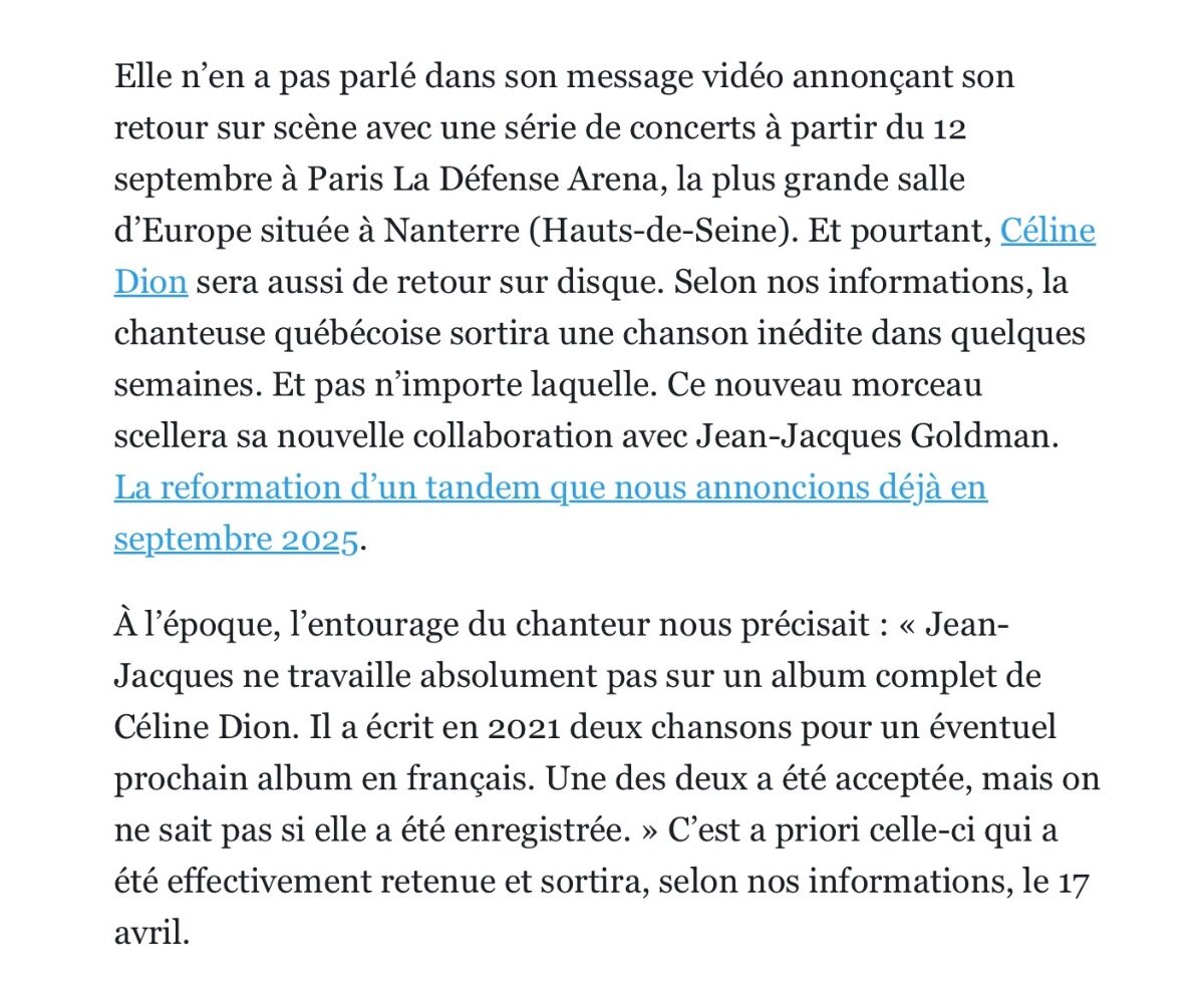 Céline RO Posted April 4, 2026 at 09:03 PM Posted April 4, 2026 at 09:03 PM Well, Le Parisien have gotten pretty much everything right about this comeback, so they definitely have some real inside information, and they claim that JJG’s team recently told them that he wrote two new songs for her back in 2021. Here’s the full article: https://www.leparisien.fr/culture-loisirs/musique/celine-dion-de-retour-une-nouvelle-chanson-ecrite-par-jean-jacques-goldman-sortira-le-17-avril-30-03-2026-WNEVW2WZSVEW7HBF2AGJ6QGZQU.php#:~:text=Il a écrit en 2021,nos informations%2C le 17 avril. 1 Quote The best is yet to come...