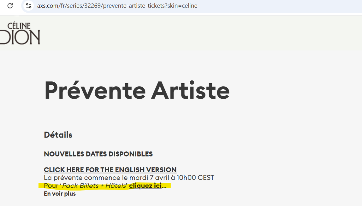 cdurand54 Posted April 7, 2026 at 02:19 PM Posted April 7, 2026 at 02:19 PM 1 minute ago, Marc29 said: How did you find the link? I found the link on ACX.com presale : https://www.axs.com/fr/series/32269/prevente-artiste-tickets?skin=celine On the top left 1 Quote