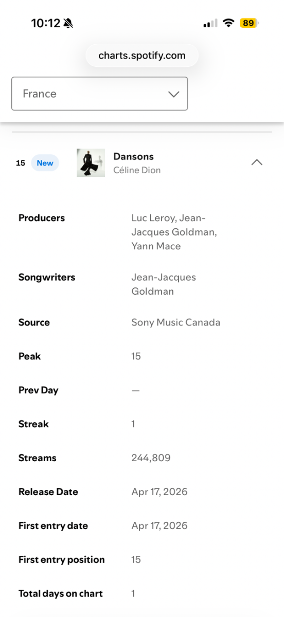 Nmj Posted April 18, 2026 at 04:20 PM Posted April 18, 2026 at 04:20 PM On 4/18/2026 at 12:10 PM, LukeD said: 650k Spotify debut is MASSIVE! So much higher than I was expecting. 244k in France alone is also really big! I actually expected the song's global streams to be around that number. The second streaming day is a Saturday which means the numbers should naturally decline. But let's see how the song does throughout the week. Oh my. Incredible news. She's smashing it. Great publicity for her francophone music. Imagine if this was an English song… it might’ve broke 1m streams. People missed CÈLINE! 👏🏽 Quote