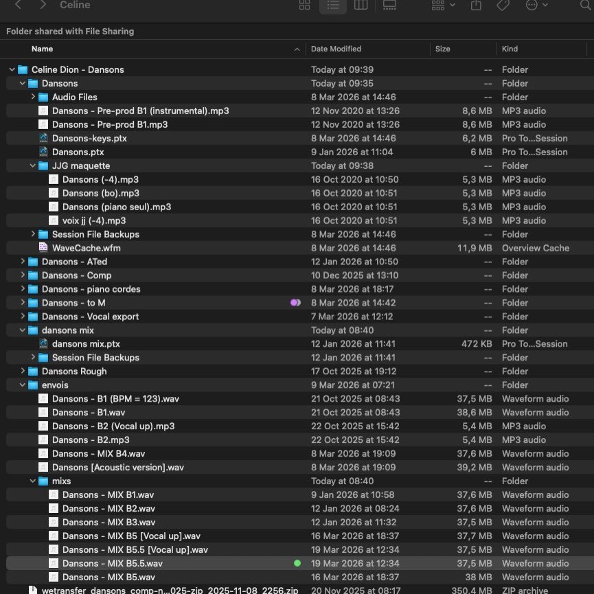 Els Posted April 18, 2026 at 12:21 PM Posted April 18, 2026 at 12:21 PM On 4/18/2026 at 2:15 PM, drove all night said: I think someone here posted it already, but I can't find it. So I do have a question: Can you see from this picture, posted by one of the producers (Luc Leroy) on Insta, when Céline's vocals were recorded? You can't tell from this image because the "Date modified" label is just the last time the files were opened. But in his instagram post, he said he received the first recordings of vocals in September. And elsewhere it has been reported that additional vocals or a different version (unclear which) were recorded for this track as recently as January Quote